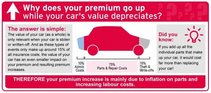 Premiums tend to increase in line with inflation as time goes by. In addition, the cost of repairs goes up year on year. It doesn’t cost any less to replace the bumper on a one-year-old vehicle than it does on a brand new one. The cost of parts, paint and labour increases each year. Doing the same repair job to the same car will cost more in future years, even though the value of the car is less. In addition, with the lion’s share of claims coming from accident damage, the reduced total value of the vehicle has little bearing on the price of the premium.