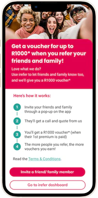- If you successfully referred someone for any of our business insurance non-life insurance products, you will receive a voucher to the value of R1,000, upon the successful collection of the first full premium for their policy.